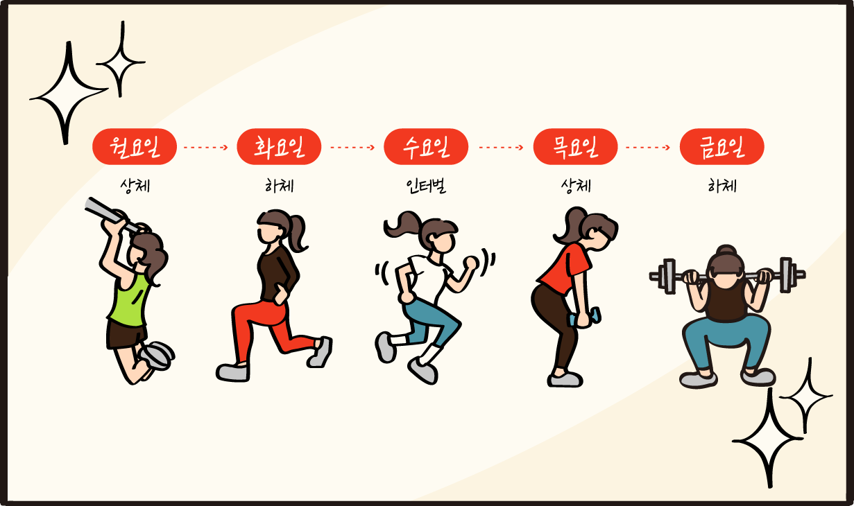 - 요일별 운동 분할 (상체, 하체, 유산소)