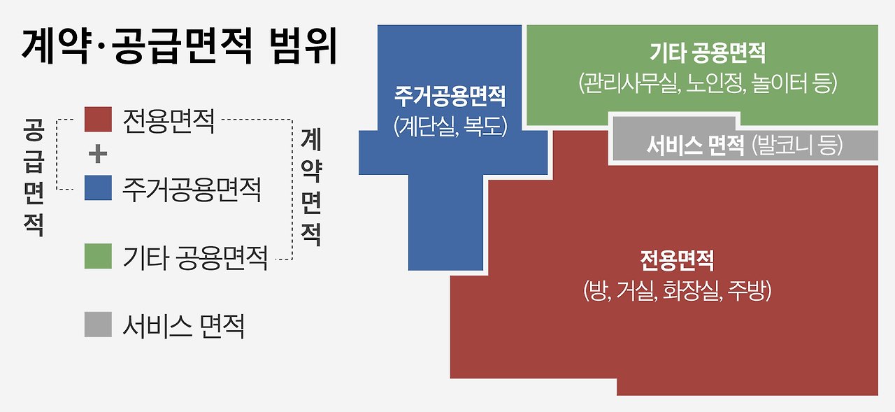 공급면적은 전용면적에 더해 주거공용면적을 합산한 개념입니다. 여기서 주거공용면적이란 같은 라인 또는 같은 동에 거주하는 여러 세대가 함께 사용하는 공간을 의미합니다. 예를 들어 아파트 복도, 계단, 엘리베이터 홀 등이 이에 해당합니다. 공급면적은 분양 계약 시 기준이 되는 면적이기 때문에 계약면적이라고도 불립니다. 과거에는 아파트 규모를 설명할 때 공급면적 기준으로 몇 평형인지 표현하는 경우가 많았고, 이때 사용된 표현이 바로 34평형, 24평형과 같은 말입니다.