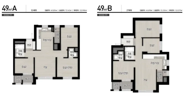 이러한 구성적 차이를 분석하면 전용59㎡ 세대가 실제로는 어느 정도의 공간감을 제공하는지, 몇 명의 가족이 거주하기 적합한지, 평면 구조에 따라 활용도가 어떻게 달라지는지 등을 종합적으로 이해할 수 있습니다. 59㎡는 일반적으로 방3개 구성으로 실현되며, 맞벽형, 타워형, 판상형 등 아파트 구조에 따라 내부 면적 배분이 다르므로 단순 평수로만 판단하기보다 구조와 배치까지 함께 검토해야 합니다. 최근에는 59㎡도 다양한 타입이 존재해 4베이, 3베이, 드레스룸 확장 여부 등 평면에 따라 체감 가용 면적이 크게 달라짐을 확인할 수 있습니다.