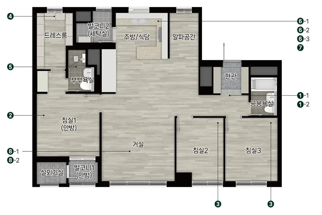 전용59㎡의 주방 공간은 ㄷ자형 또는 일자형으로 구성되며, 확장 시에는 주방 폭이 넓어지고 수납 공간이 확보되는 장점이 있습니다. 가족 구성원에 따라 맞춤형 확장이 선호되며 발코니 확장을 통해 거실이 넓어지는 경우 체감 면적은 한층 더 확대됩니다. 또한 최근에는 드레스룸, 팬트리, 워크인 수납공간을 포함하는 평면이 증가하여 단순 평수 기준보다 실질적인 생활 기능이 강화되는 구조로 진화하고 있습니다.