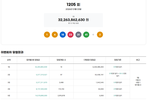 제1205회 로또는 1등 당첨번호 1, 4, 16, 23, 31, 41과 보너스 2번으로 정리되며, 1등 10명이라는 비교적 적은 당첨자 수로 인해 1인당 당첨금이 약 32억 원대로 크게 형성된 회차였습니다. 저구간 번호가 3개 포함되고 합계가 116으로 낮았다는 점, 연속번호가 없었다는 점, 그리고 자동 9명-수동 1명으로 자동 비중이 90%까지 올라갔다는 점은 1205회의 핵심 특징으로 남습니다. 또한 부산 3곳, 대구 2곳 등 특정 권역에서 1등 판매점이 집중된 모습도 확인됩니다.